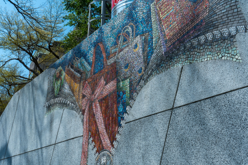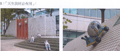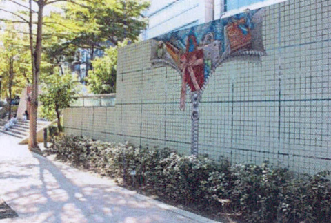The humorous visual form of this artwork expresses the spirit of the community and place. The coffer appearing behind the collapsing wall symbolizes the local business opportunities and potential. The anthropomorphized creatures represent the commercial exchanges and interactions of the inhabitants of the community, and add new elements to the cold, gray control room and rapid transit station exit, transforming them into artworks reflecting local images. The work becomes an expression of the public space and leads the public into a dialogue with the aesthetics of the environment.