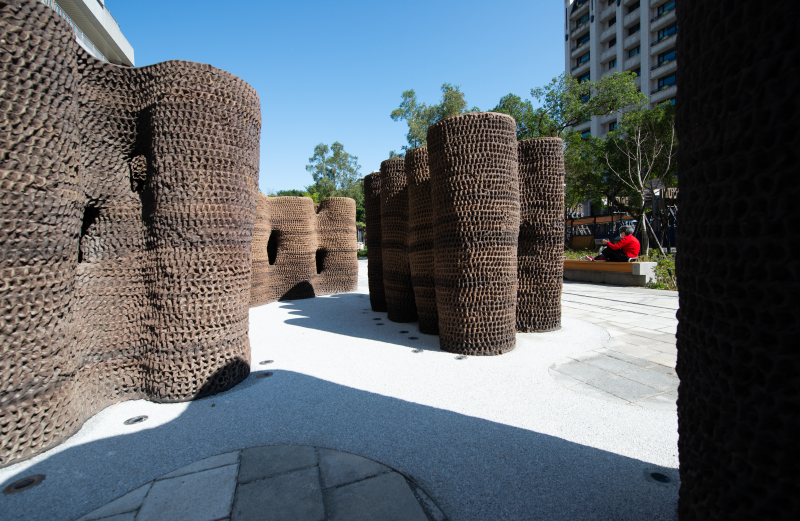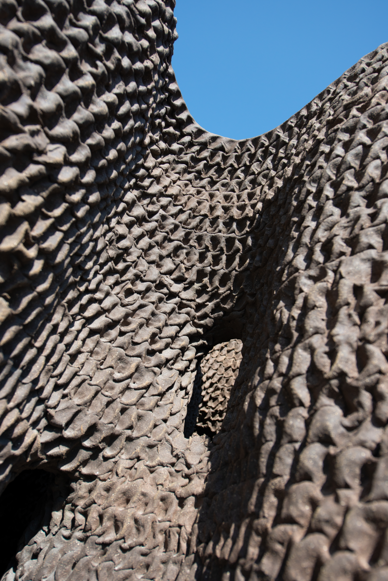 These sculptures in the form of valleys and rnountain paths harmonize with the surrounding trees and plants and express a deep cornection with the arth.