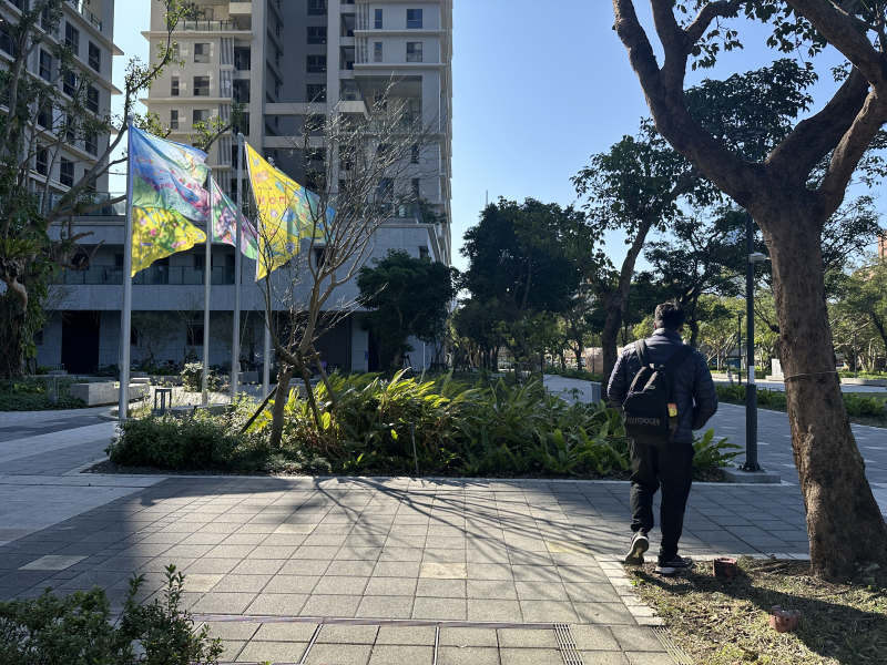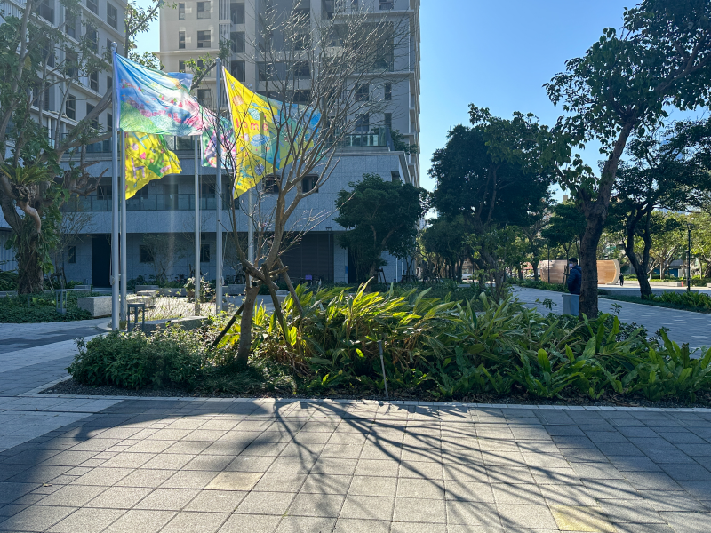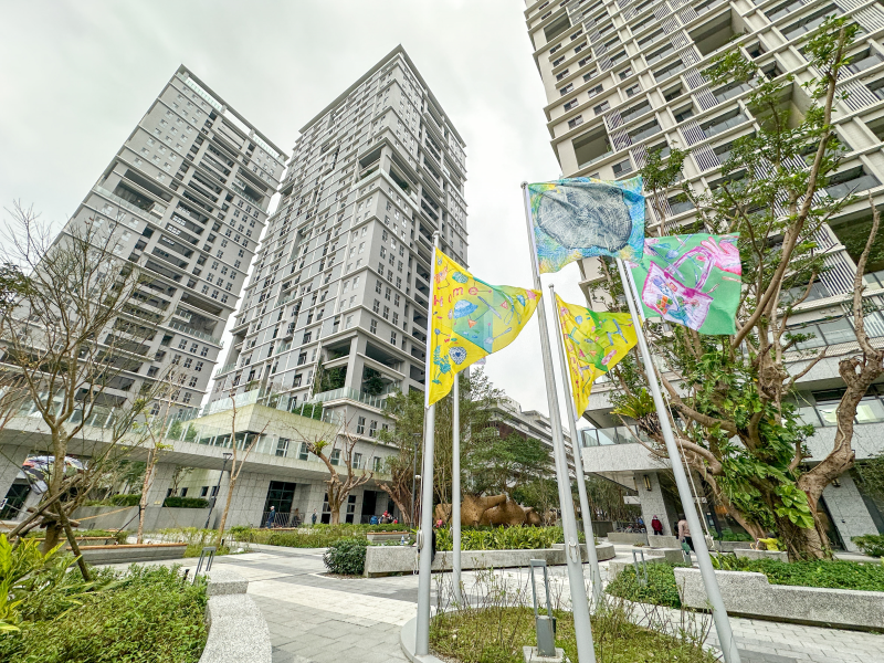 Five flags connected as a ring in the heart of the garden, represent the five buildings of Kuang Tzu social housing. The residents corne from different backgrounds. This work also symbolizes the value of diversity and hope for new bond.